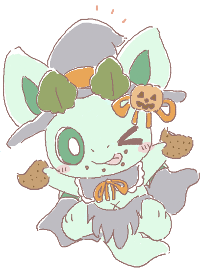 そんな今更な話は置いておいて、同じハロウィンな感じのカッシーくんとはいえ、数日前とは違う魔法使いな感じのカッシーくんだよ。魔法使いらしく帽子やローブを身に着けているし、腰みのの色も普段と違う気がするよ。でも両手に持っているのはおいしそうなクッキーだから、やっぱりいつも通りのカッシーくんだよね。