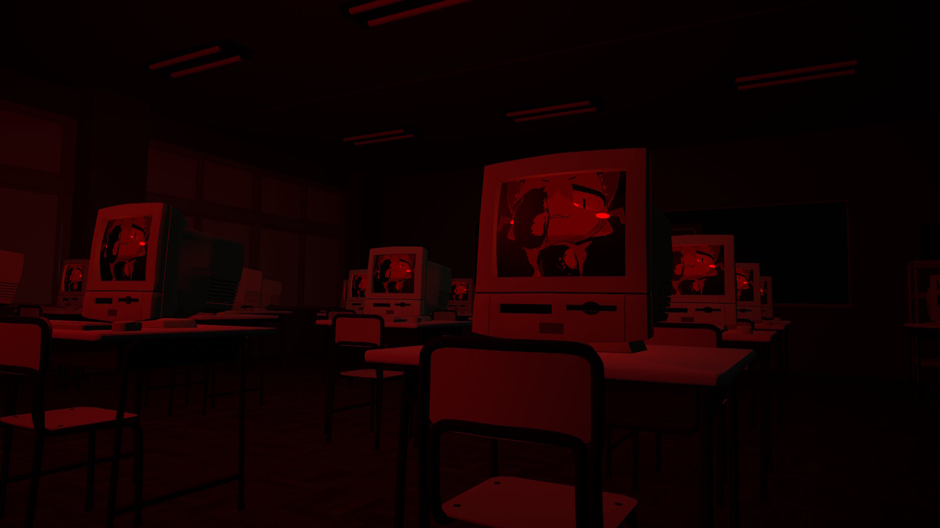 次に向かったのは「PC ROOM」。人数上限は16人で、びっくり演出はないよ。恐らく学校のコンピュータールームらしき空間で、なんらかの怪奇現象によってパソコンたちがオレ達に怖い画面を見せてくるんだよ。