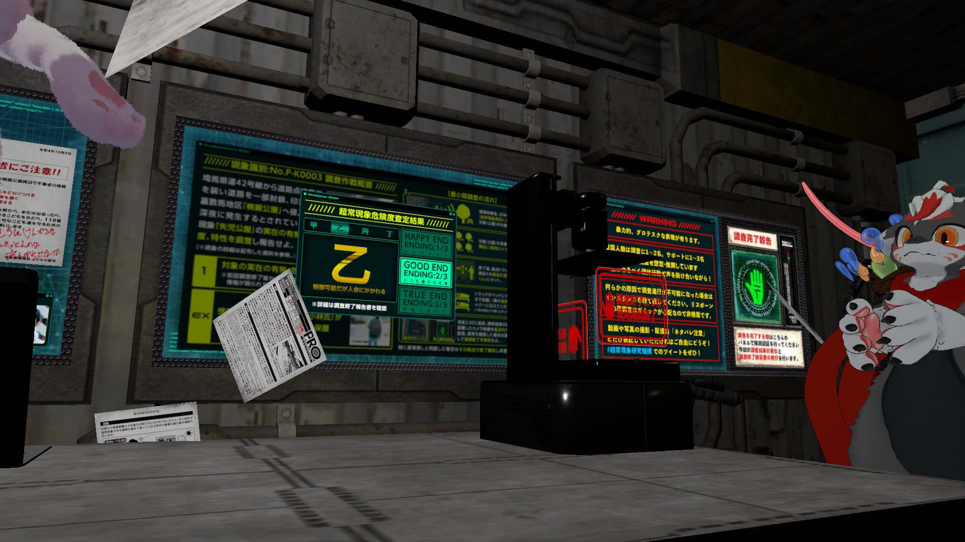 ちなみにオレはあまり頭は使わずに一本の道を進む感じのホラーワールドが好きな方なんだけど、こういうお仕事のようなことを体験しながら徐々にホラーも体験できるこんな感じのワールドも結構好きかもしれない。うまく言い表せないけど、テレビ番組でネッシーやチュパカブラやUMAを探すような特集をよく見るよね。それをバーチャルの世界で関わっている感じ。