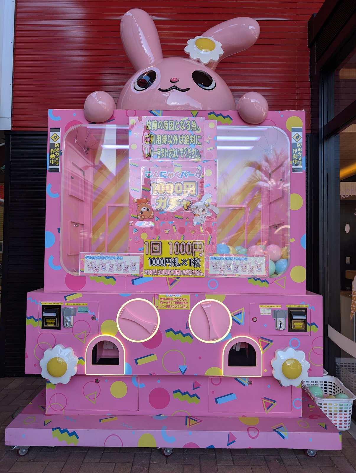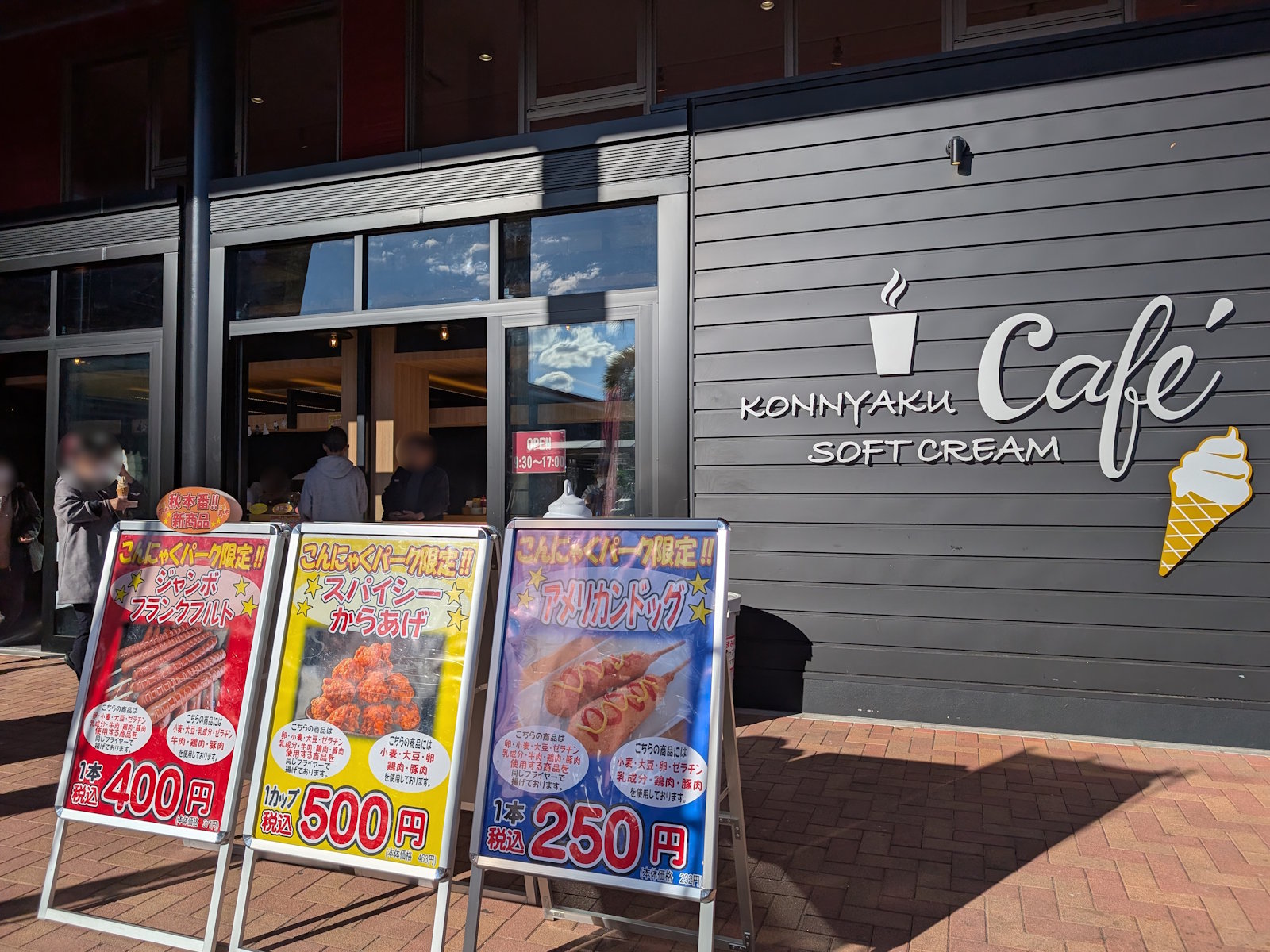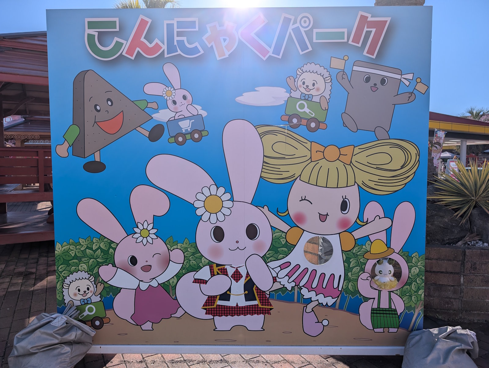 すぐに屋内の中に入ってしまったから、屋外をあまり見ていなかったよね。というわけで屋外をぐるぐると見ていたんだけど、マナンちゃんたちが描かれた大きなフォトフレームがあったり、いずれかのマナンちゃんのぬいぐるみが手に入る千円ガチャがあったり、地元の農家さん達が育てた野菜などが売っているコーナーがあったり、こんにゃくパーク限定の唐揚げやフランクフルトが売っていたりと、ローカルなテーマパークという雰囲気が広がっていたよ。メジャーな大規模テーマパークの雰囲気もいいけど、こういうローカルな感じもいいよね。