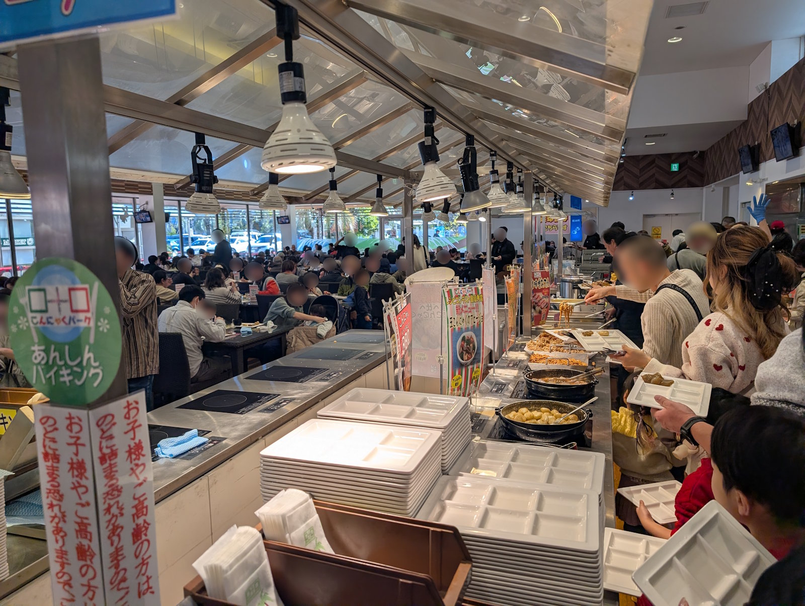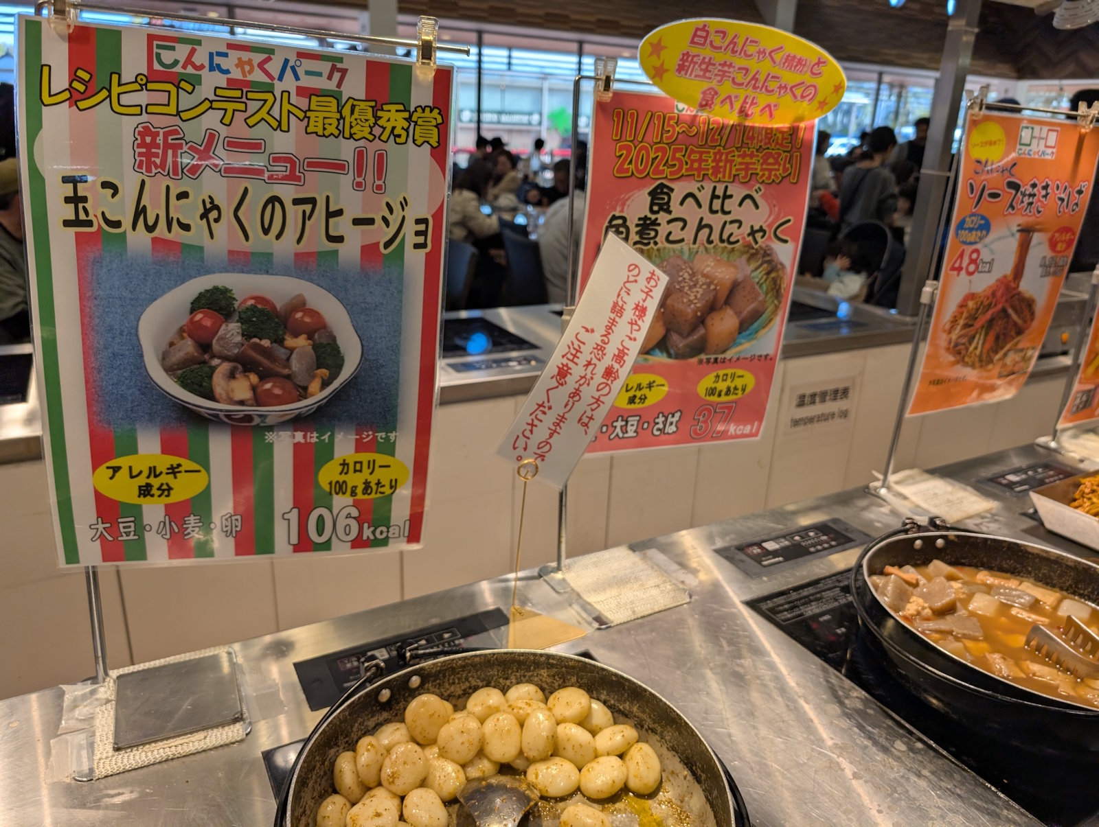 そしておまちかねのこんにゃくバイキングだよ。休日ということもあってなかなかの混み具合。そりゃなんていったって無料だからね。観光地だけど、近場の常連もいそうだよね。そんなバイキングのメニューだけど、こんにゃくでできたアヒージョや焼きそばに角煮に唐揚げに田楽おでんと、こんにゃくで再現できるものは何でもやってみたというラインナップだよ。こんにゃくラーメンも取る余裕がなかったから、友達が手に取っていたラーメンを少し食べさせてもらったけど、まさしくラーメンだったよ。こんにゃくで出来ていることを言われないと気付かないかも。このヨコオデイリーフーズの謎技術は果たして一体。