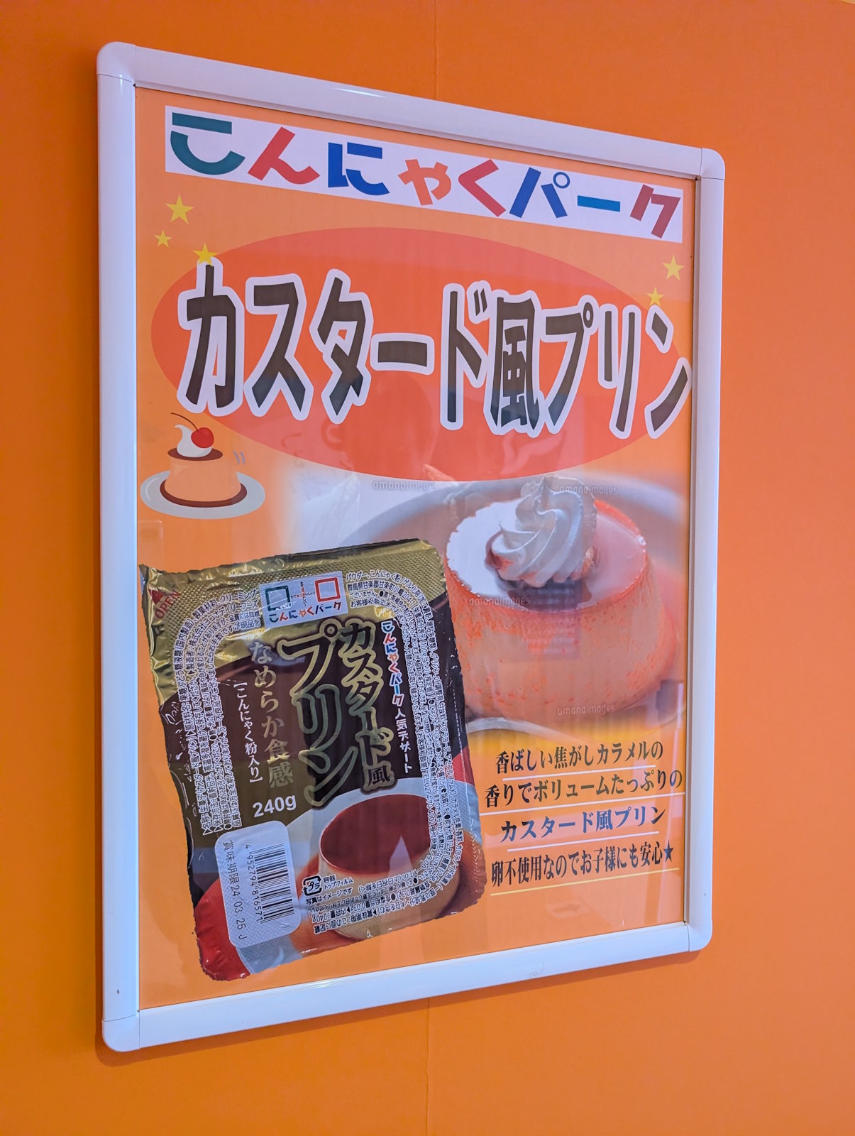 工場見学の順路を進んでいけば沢山のマナンちゃんが見られるわけだけど、他にも色々なこんにゃく商品のポスターが掲げられていて、中でもカスタード風プリンというのがちょっと気になったね。プリンとはいっているけど、実はこんにゃくでできていたりするのかも。