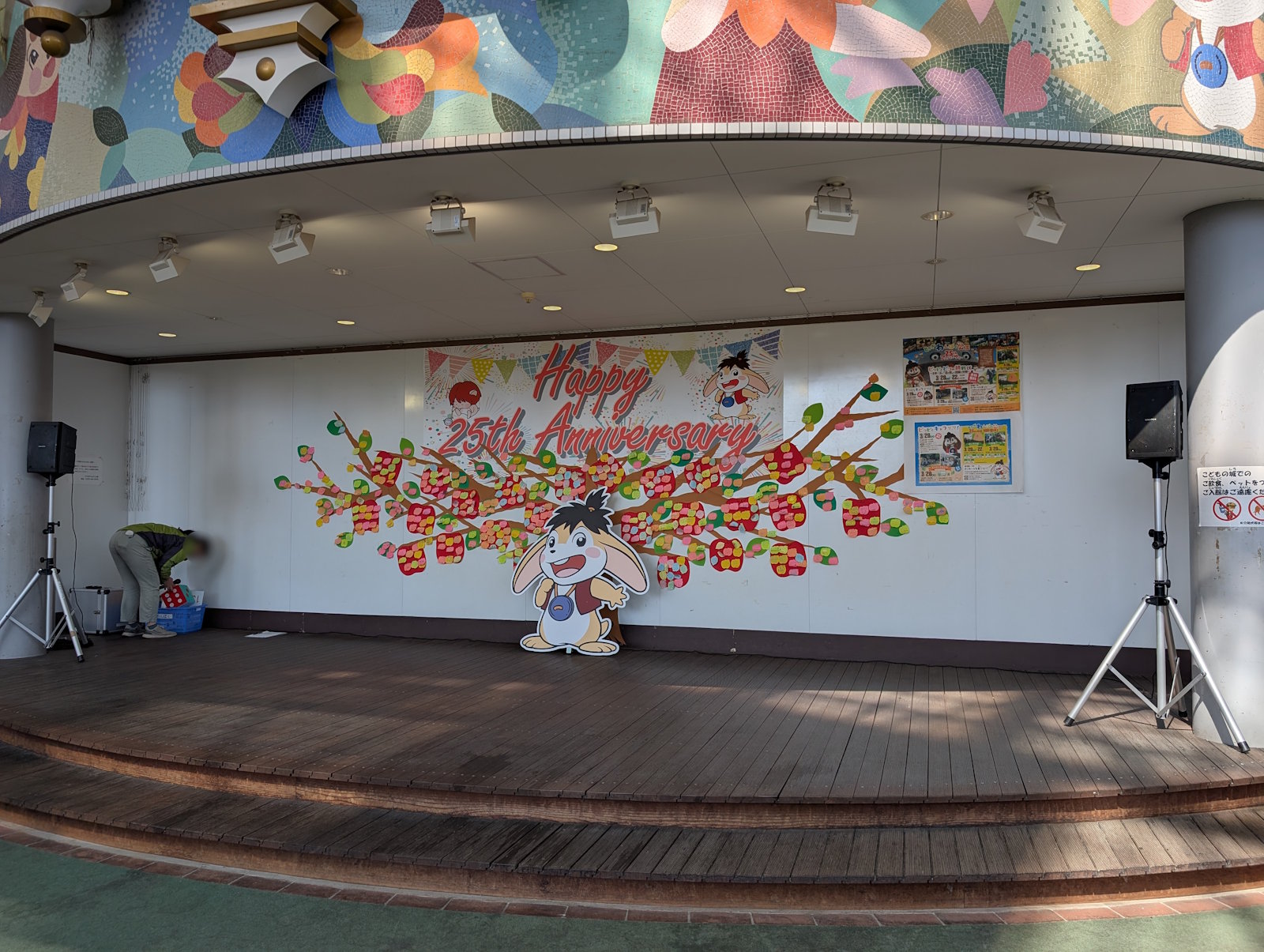 前日の3月20日では近隣のキャラクター達も来ての一緒に写真撮影もできるイベントが行われたけど、今日はいつものピッピくんと遊べるイベントだよ。いつものではあるんだけど、今回行われるステージでは25周年記念の装飾が施されていて、この装飾をよく見ると、みんなのメッセージが貼られているんだよ。さすがは25周年というだけあって豪華な感じだね。