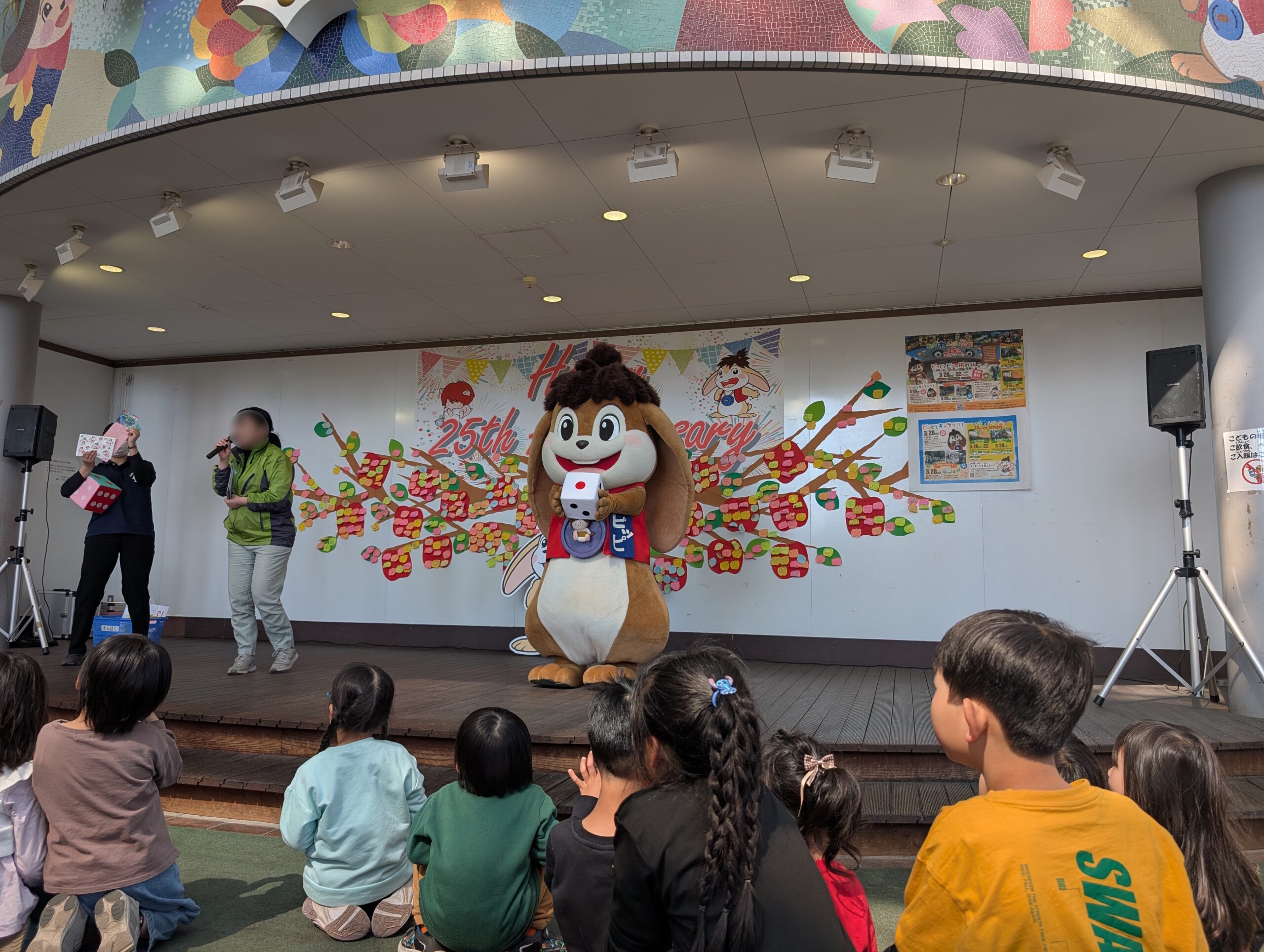 とちぎわんぱく公園でピッピくんと25周年記念の装飾で賑やかなステージと一緒に写真を撮ったよ